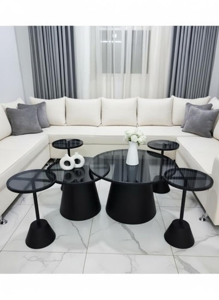 طقم فاخر مكوّن من طاولة ضيافة رئيسية مع 4 طاولات خدمة صغيرة تُدمج داخل بعضها لتوفير المساحة. يأتي التصميم بإطار معدني أنيق من الصاج المطلي باللون الأسود، مع سطح زجاجي أسود يضفي لمسة عصرية وفاخرة على المكان.