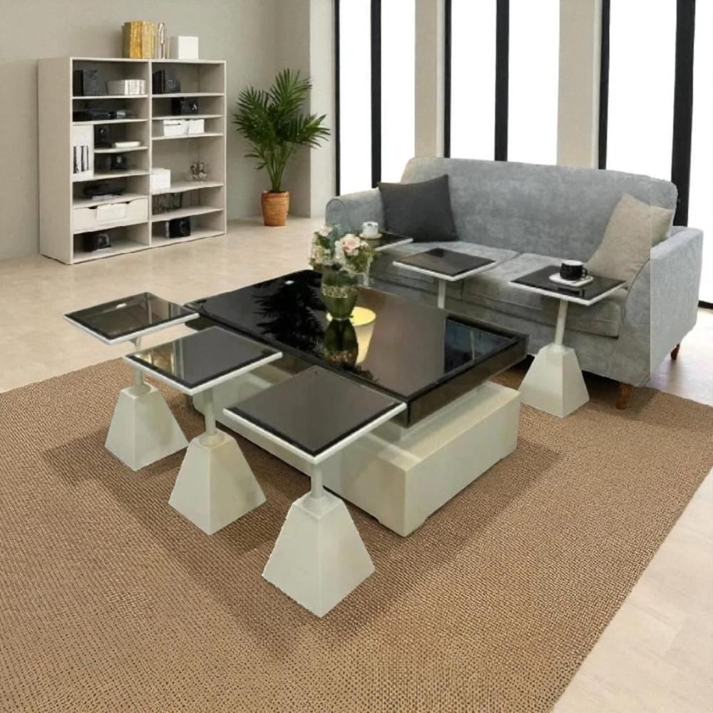 _الوصف:_ طقم طاولات مجلس كنب مرتفع مع 6 طاولات خدمة، بسطح زجاج مرايا وقواعد من بديل الرخام، يضيف لمسة من الفخامة والرقي إلى المجلس.