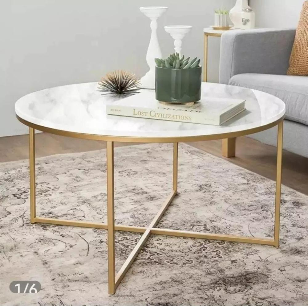 طاولة قهوة دائرية عصرية  سطح خشبي شبيه الرخام لون ذهبي